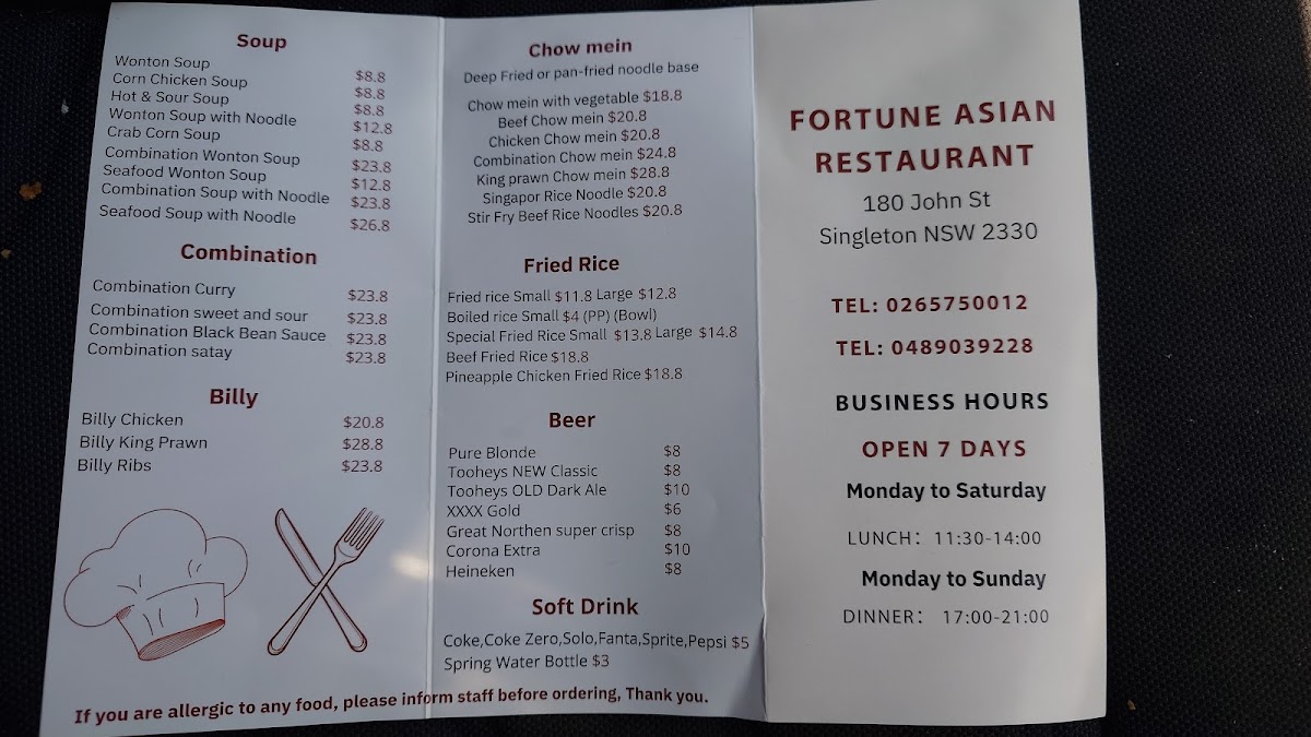Introducing Fortune Asian Restaurant, a culinary gem nestled in Singleton, NSW. This eatery offers an exquisite blend of traditional Asian flavors that resonates deeply with its patrons. Guests rave about dishes like the tender beef and black bean and the outstanding San Choy Bow, both of which embody the restaurant's commitment to quality ingredients and authentic taste.